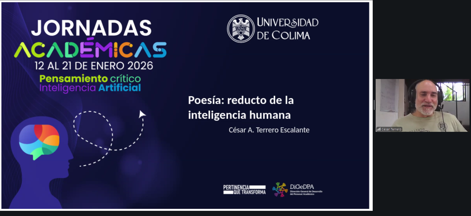 César Augusto, profesor de la Facultad de Ciencias de la UdeC, impartió la charla virtual “Poesía; reducto de la inteligencia humana”, hace unos días, como parte de las Jornadas Académicas 2026 que organiza la Universidad de Colima.