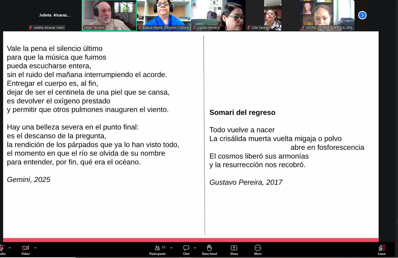 Para finalizar la actividad, las y los participantes comentaron y agradecieron el espacio para reflexionar sobre la poesía. Al tomar la palabra, la universitaria Alejandra Heredia dijo que la poesía “es una manera en la cual se mueven emociones, eso es algo que a veces no se sabe o no se quiere”.