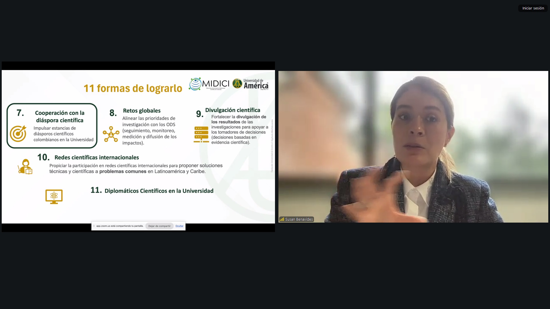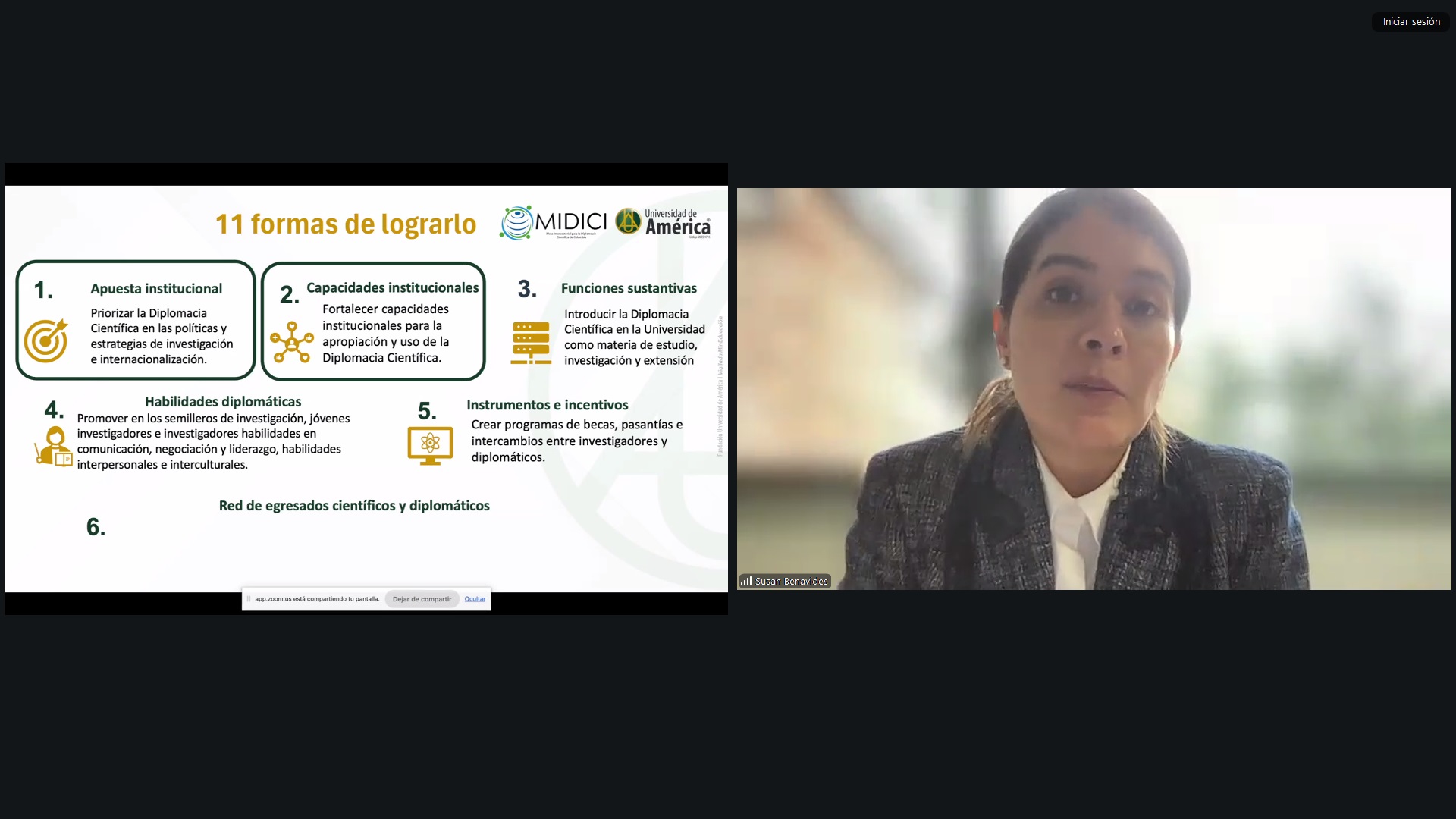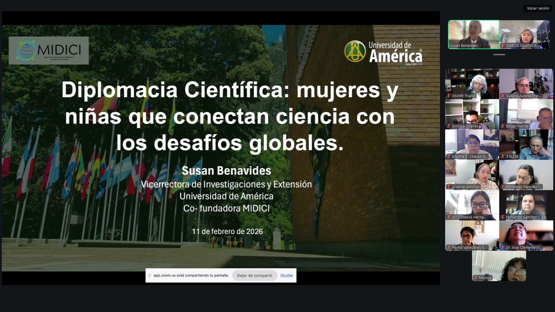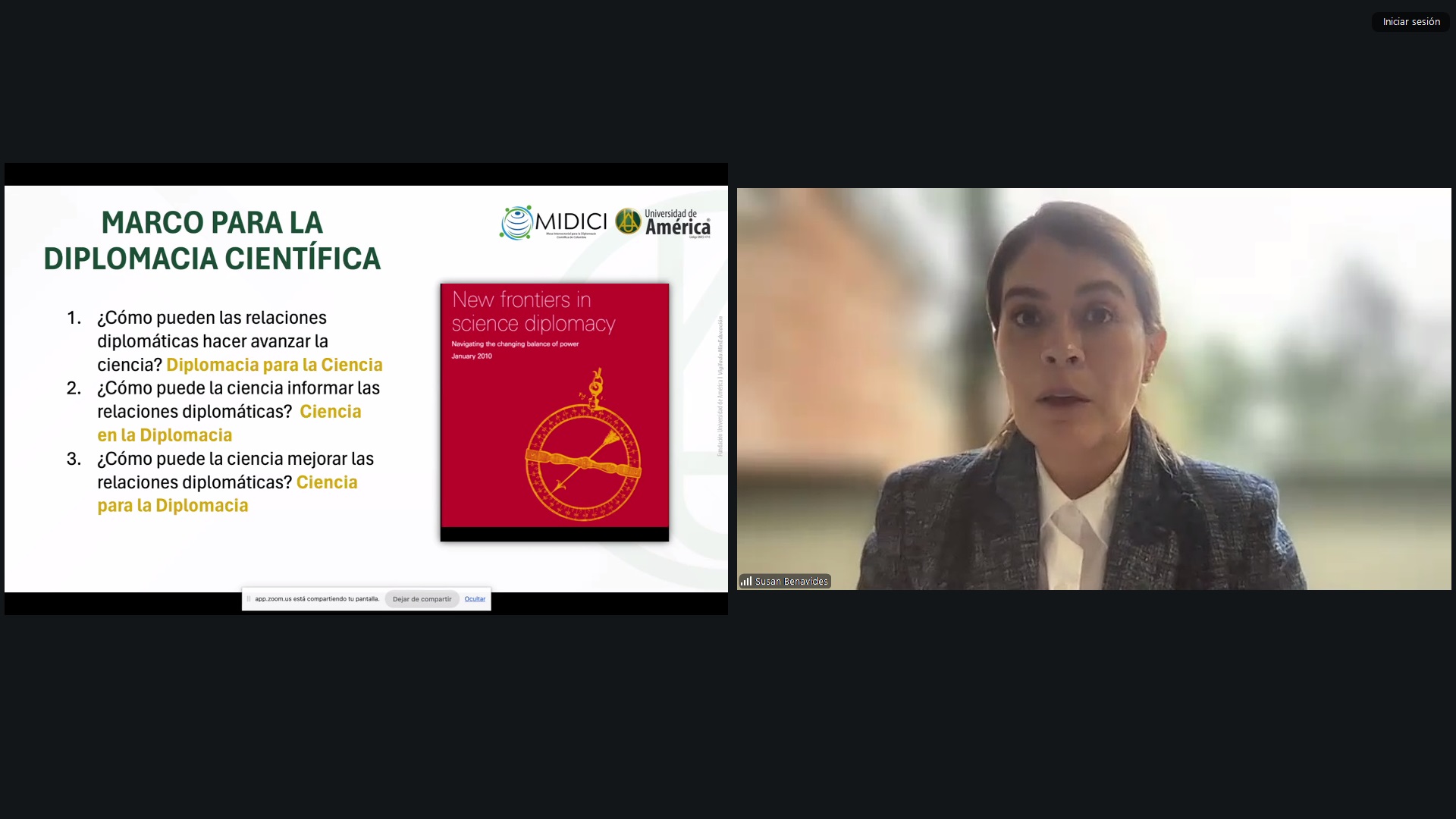 Como parte de la conmemoración por el Día Internacional de la Mujer y la Niña en la Ciencia la Universidad de Colima, a través de la Coordinación General de Investigación, llevó a cabo la conferencia virtual: “La diplomacia científica”, a cargo de Susana Margarita Benavides Trujillo, vicerrectora de Investigación y Extensión de la Universidad de América, Colombia. En su charla, habló sobre la importancia de construir puentes entre países, incluso en contextos de tensión o conflictos, a través de la evidencia científica.