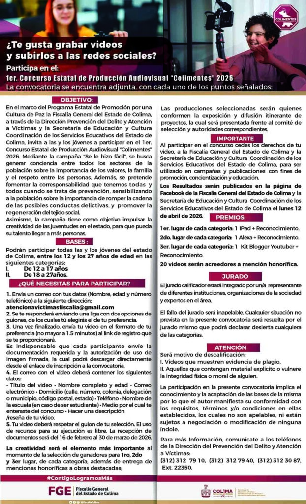 Convencidos de que la prevención del delito comienza con la participación activa de las y los jóvenes, la Fiscalía General del Estado de Colima (FGE), en coordinación con la Secretaría de Educación y Cultura, presentó el 1er. Concurso Estatal de Producción Audiovisual “Colimentes” 2026, una iniciativa que apuesta por el talento juvenil como motor de transformación social.