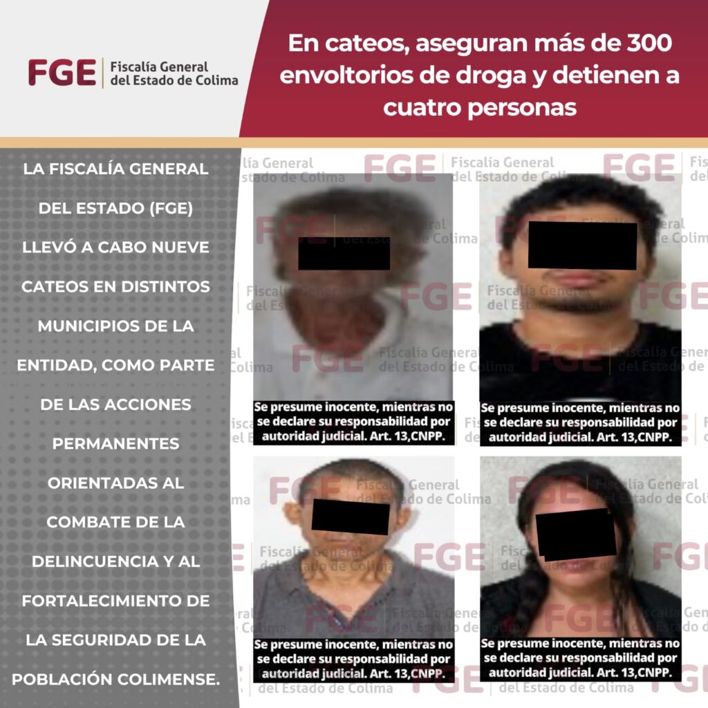 Durante el desarrollo de los cateos fueron detenidos una mujer y tres hombres por delitos contra la salud, quien quedó a disposición de la autoridad correspondiente para la integración de las carpetas de investigación.