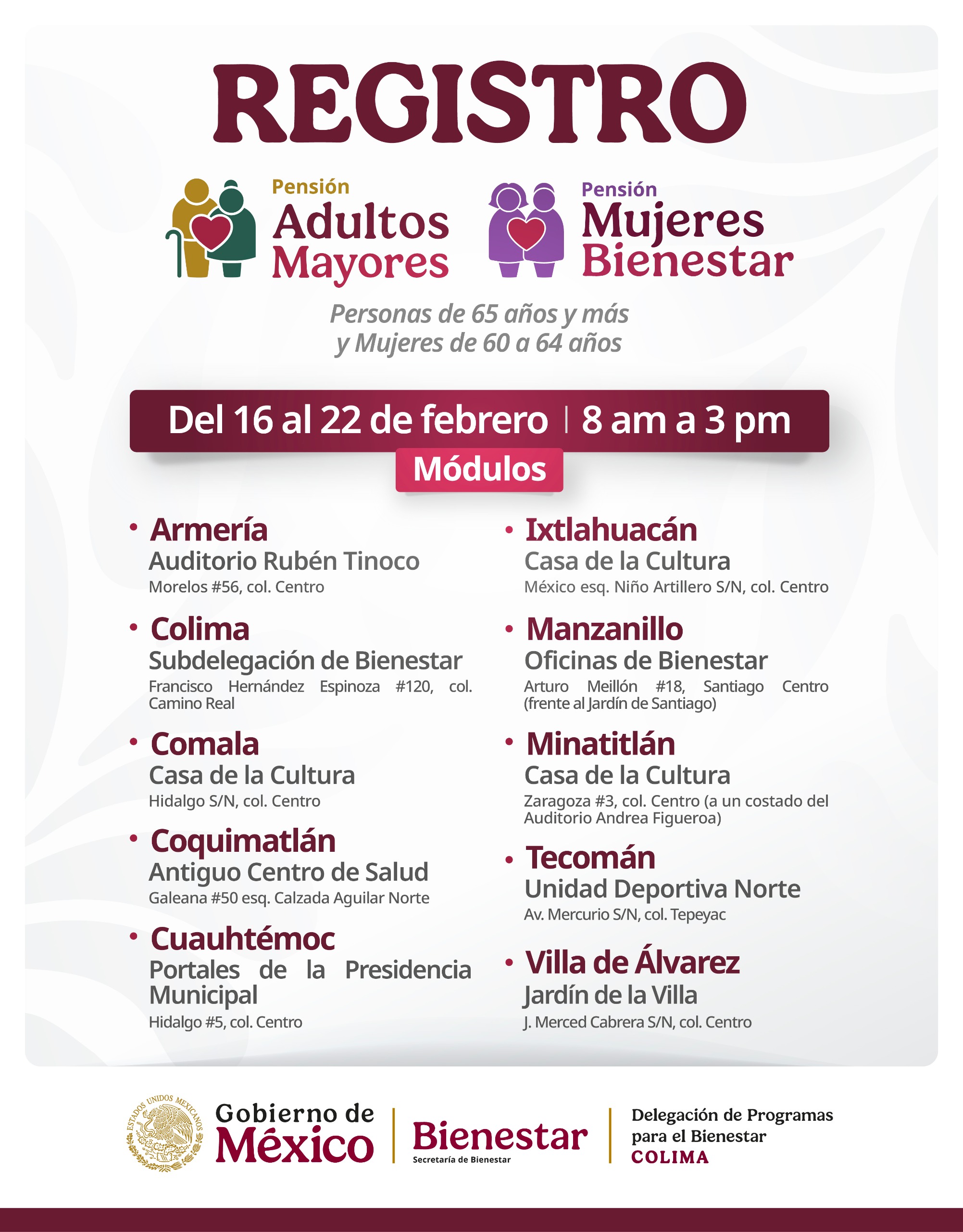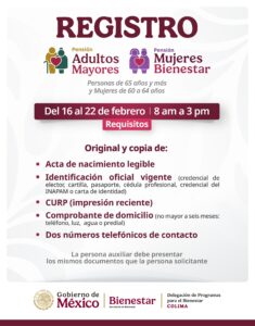 Explicó que más de 2 mil 500 módulos se encuentran instalados en diferentes puntos del país, para realizar el registro. Los módulos permanecen abiertos de lunes a domingo de 10:00 de la mañana a 04:00 de la tarde. Para ubicar el módulo de registro, se puede consultar la página de la Secretaría de Bienestar: www.gob.mx/bienestar.