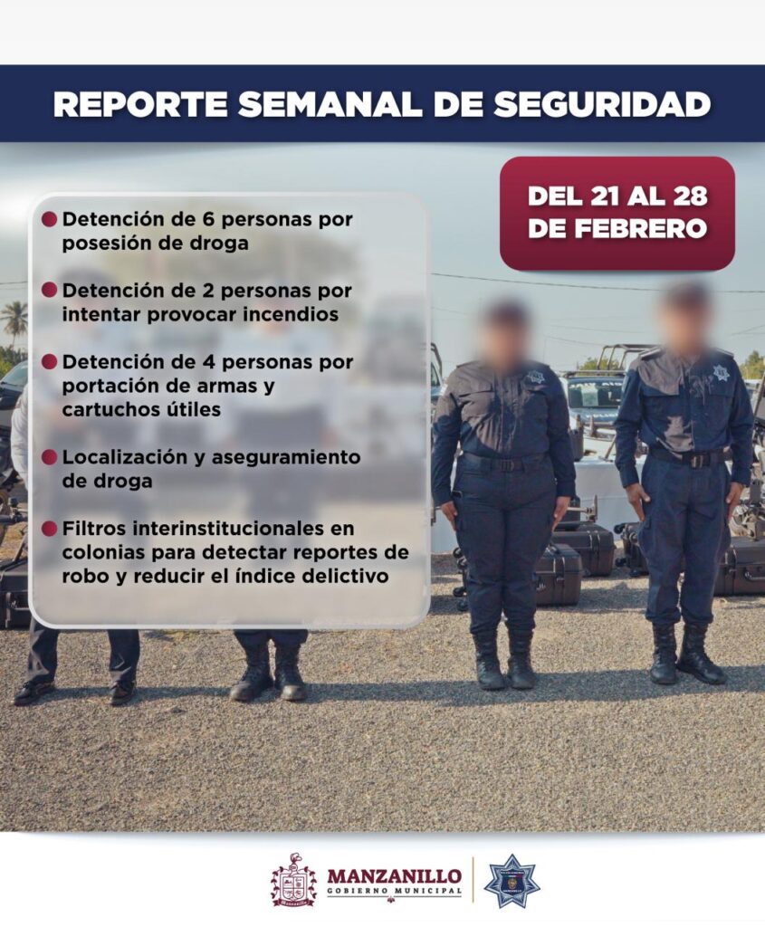 La Dirección de Seguridad Pública de Manzanillo informó que, como resultado de los patrullajes permanentes y operativos preventivos realizados en distintas colonias del municipio, se logró la detención de 6 personas, presuntamente relacionadas con delitos contra la salud, entre ellos el consumo y la posible distribución de sustancias ilícitas.