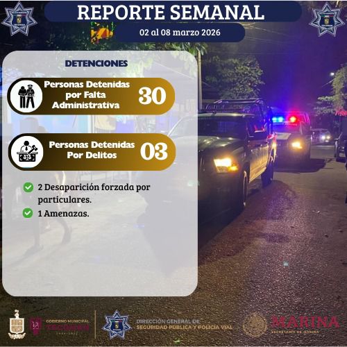 De acuerdo con el informe, durante esta semana 30 personas fueron detenidas por faltas administrativas, mientras que 3 personas fueron detenidas por la probable comisiรณn de delitos, de los cuales dos corresponden a desapariciรณn forzada por particulares y uno por amenazas.