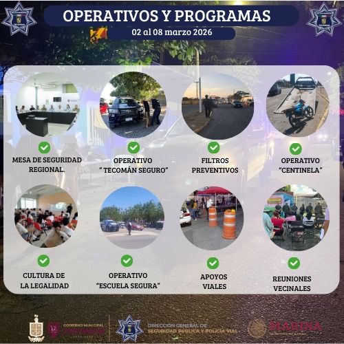 El Gobierno Municipal de Tecomรกn, a travรฉs de la Direcciรณn General de Seguridad Pรบblica y Policรญa Vial, dio a conocer el reporte semanal de acciones y resultados correspondiente al periodo del 02 al 08 de marzo de 2026, como parte del trabajo permanente en materia de prevenciรณn, vigilancia y proximidad social en el municipio.